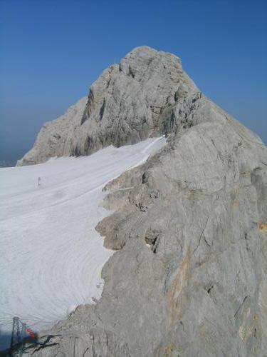| Der Koppenkarstein im Spätnachmittags-Licht - vorne (unten) der Einstieg in den Hunerscharten-Klettersteig |