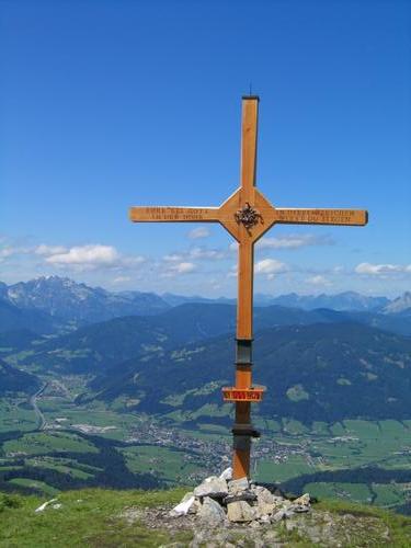 Am Lackenkogel-Gipfelkreuz in 2.051 Meter Höhe - unten im Tal liegt Altenmarkt