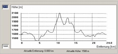 | Das Höhenprofil verrät, warum bei einer Höhendifferenz zwischen Ausgangspunkt und Gipfel von ca. 500 Höhenmeter knappe 1.400 Aufstiegshöhenmeter zusammenkommen können. Ein ständiges Auf und Ab mit den 2 deutlichen Anstiegen auf Almkogel und Gamsstein (etwas niedriger). |