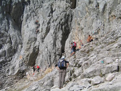 | Durch das höhere "Verkehrsaufkommen" haben wir Gelegenheit, uns mental auf den Einstieg einzustimmen. Ingrid "beäugt" die Dinge, die da kommen, mit gehörigem Respektabstand. Martin sitzt etwas gelangweilt rechts oben am Fels - davor Helmut und Bettina. |