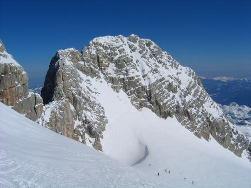 | Blick hinüber zum Niederen Dachstein - und unten erkennt man bereits die zahlreichen Tourengeher, die in Bälde zu uns stoßen werden. |