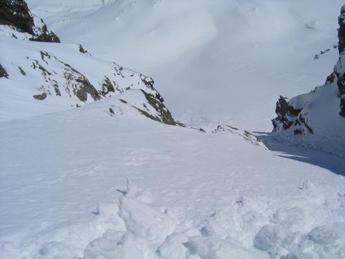 | Hier habe ich ungefähr die Hälfte der 150 Meter hohen Steilrinne bewältigt. Der Aufstieg erfolgte rechts im Schatten. Der Schnee ist nicht allzu hart und kann ohne Steigeisen begangen werden. Allerdings empfiehlt es sich, jeden Schritt konzentriert in die Scheedecke zu rammen, um nicht mit dem Neuschnee ins Rutschen zu kommen, wie es mir beim Abstieg hier passiert ist. An diesem etwas "flacheren" Stück, habe ich die Kamera zur Hand genommen ... |