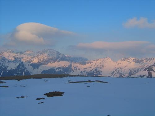 | ... während es im Süden und Westen ziemlich wolkenlos ist. Die Gipfel um Schöderkogel und Sauofen - eingehüllt in das typische Orange der Morgensonne. |