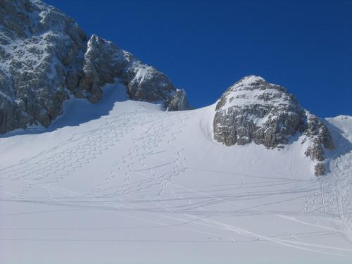 Kaum eine freie Stelle, an der Tourengeher noch nicht ihre "Marken" in den Schnee gesetzt haben.