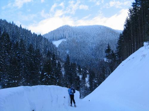 Vom Gscheidegger geht ein geräumter Forstweg bis zu einem Parkplatz weiter oben - Ingrd schaut über den Schneeriedl - ihr steht das (gefrorene) Wasser bis zum Hals