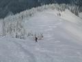 Im kalten Wind am Gipfelkreuz. Die Gipfelbuchkassette ragt kaum aus dem Schnee heraus. Blick über den Gipfelkamm. Interessanterweise ragen die Gipfelwächten in 3 verschiedene Richtungen. Auf der linken Seite erkennt man deutlich die Anrissstelle eines Schneebrettes. Nur 1 Pärchen war heute noch außer uns am Gipfelkreuz - weiter unten sieht man die Spuren des Windes Bei der Abfahrt. Noch einmal ein Blick zurück über die letzten 150 Höhenmeter.