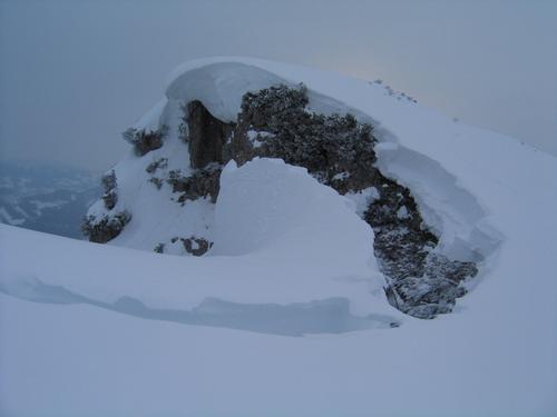 | Ein großes Schneebrett hängt nur mehr am "seidenen Faden". Beachtenswet sind die Tierspuren am abgebrochenen Teil. |