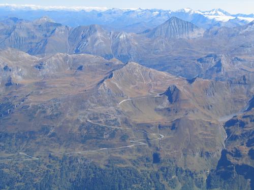 | Im Osten blickt man über die Großglockner-Hochalpenstraße hinweg in die Goldberggruppe mit dem gerippten Ritterkopf (rechts hinten) ... |