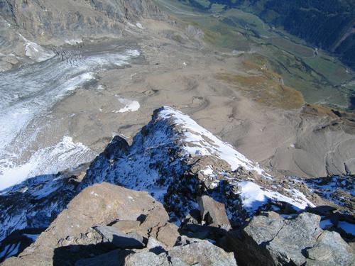 | Vom Gipfel hat man aber nicht nur alles überragende Ausblicke, sondern kommt auch in den Genuß gewaltiger Tiefblicke. Auf dem 1. Plateau unter mir - ca. 1.100 Höhenmeter tiefer liegt die Schwarzenberghütte (etwas rechts des Felsvorsprunges im grünlichen Bereich). Und noch einmal 1.100 Höhenmeter darunter liegt das Ferleiten-Tal, von wo ich heute morgen aufgestiegen bin. |