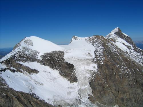 | Die nahen (ca. 2 bis 3 Kilometer Luftlinie) Nachbarn im Norden: Von der Klockerin (links) über die Braschenköpfe zum überragenden Wiesbachhorn (rechts). |