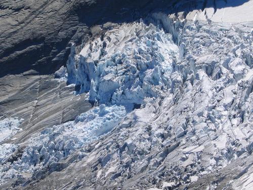 | Beim Abstieg bewundere ich die bläulich leuchtenden Gletschermassen südlich unterhalb der Hohen Dock. Ständig vernimmt man ein Krachen und Ächzen ... |
