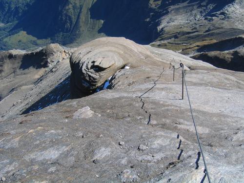 | Da bin ich froh, hier am vergleichsweise recht sicheren Fels unterwegs sein zu dürfen. Beim Abstieg habe ich auch die Klettersteigsicherung eingehängt, um zügiger und sicherer voranzukommen ... |