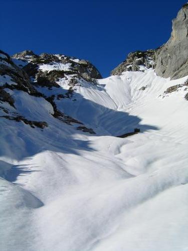 | Das etwas steilere Schneefeld unterhalb der Scharte ist erreicht. Der Schnee wird in den sonnenausgesetzten Hängen in der ungewöhnlichen Hitze schnell durchgehend feucht und patzig. |