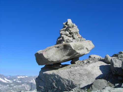 Markierungen und Steinmandln geleiten über kleine Firnfelder, meist aber über leichtes Blockwerk Richtung Gipfel ...