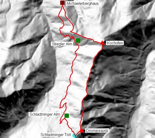 | Die Rundtour im Relief-Blick: Start beim Michaelerberghaus - Aufstieg über das Loskögerl zum Kochofen - Gratwanderung über Fleischkögel und Lafenberg zum Dromeisspitz - Abstieg über das Schladminger Törl zur Schladminger Alm. Weitgehend Forststraßen-Wanderung zur Stiegleralm - Dort einige Wegerkundungen und Verhauer. Zurück zum Michaelerberghaus. |
