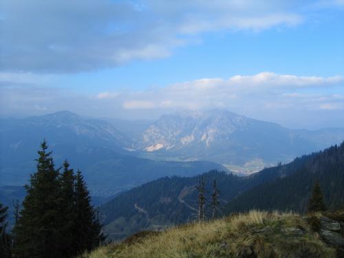 | Fernblick nach Gröbming, das gerade von der Sonne gesegnet ist (rechts). Darüber die Kammspitze. Links am Fuße des Kammes erkennt man das Schotterabbaugebiet in Winkl. |