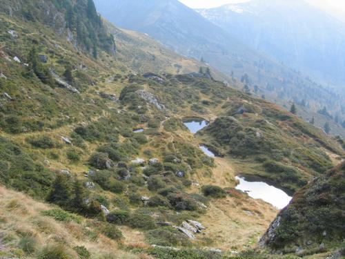 | Vor dem Dromeisspitz wechselt man die Wiesenflanken von der Südost- auf die Nordwestseite - hinunter zu einigen kleinen Lacken, die im Sonnenschein sicherlich besser zur Geltung kämen. |