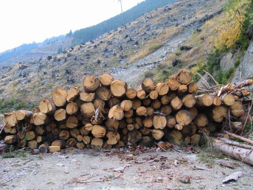 | An einer Stelle blockiert ein Holzstapel den Weg. Links geht es sehr steil hinunter - rechts steigt ein Felsen auf. Der einfachste Weg führt direkt ÜBER den Stapel. |