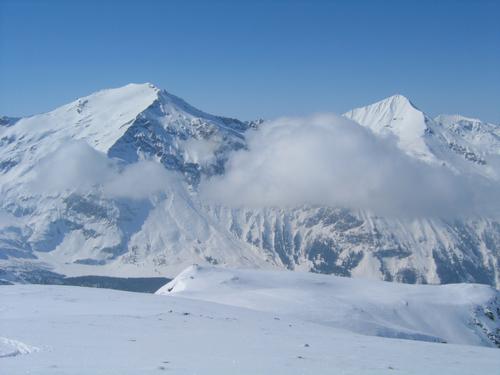 | Hocharn (links) und Ritterkopf (rechts). Unten links liegt Kolm-Saigurn. Um die Mittagsstunden steigt der Nebel aus dem Rauriser Tal in die Berge. |