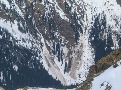 Allerorts sieht man Grundlawinen, die über die steil abfallenden Hänge abgegangen sind.