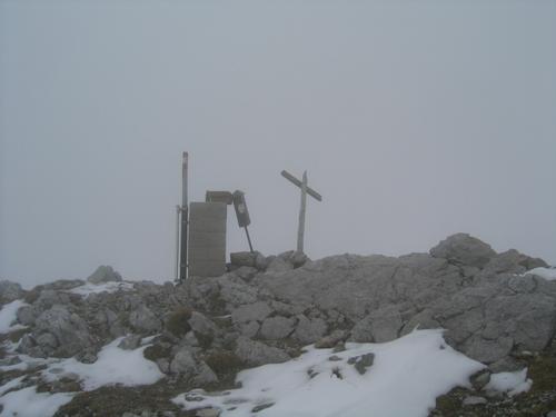 | An eingen Stellen sind leichte Klettereinlagen erforderlich - durch ein bißchen Schnee und den eiskalten Felsen etwas verschärft. Dank des Nebels sieht man wenigstens die Ausgesetztheit des Geländes nicht so gut ;-). Schließlich erreiche ich den Nebengipfel, mit etwas marodem Gipfelkreuz und stark verrosteter Gipfelbuchkassette (ob ein Buch drinnen war, vermag ich nicht zu sagen). Außer einem Grazer Wanderer, der den längsten Anstieg vom Bahnhof Hieflau aus gewählt hat, weit und breit niemand zu sehen. |