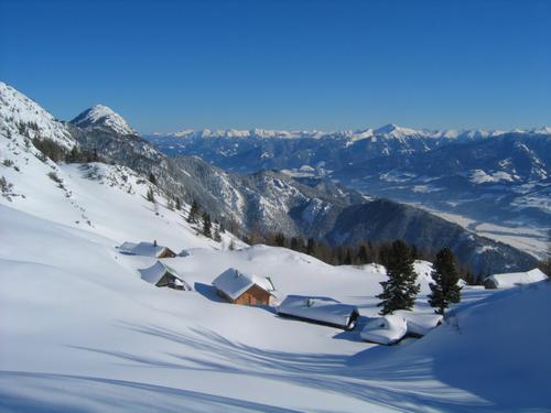 | Bei der idyllisch gelegenen Stornalm mit Bick Richtung Osten zum Stoderzinken (links) und hinunter ins Ennstal. |