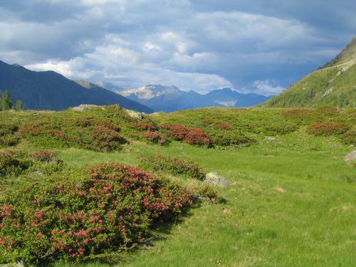 ... vorbei an in der milden Spätnachmittagssonne besonders schön leuchtenden Almrauschstauden ...