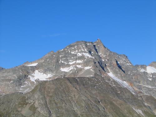 | Vom Niedersachsenhaus genießt man die Aussicht auf die nahen 3000-er der Goldberggruppe, von denen symbolhaft nur der Hohe Sonnblick mit dem auf ihm thronenden Zittelhaus gezeigt werden soll. |