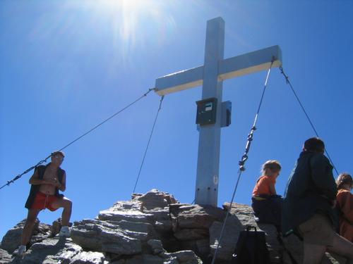 | ... während sein Kumpan beim Gipfelkreuz der nahen Baumbachspitze auf ihn wartete - natürlich in völlig adäquater Gletscher-Adjustierung. |