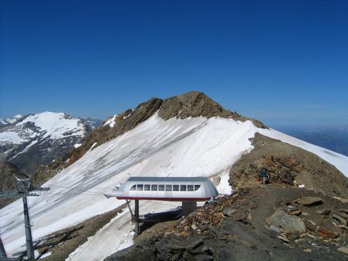 | Die Baumbachspitze ist ein in 5 Minuten erreichbarer 3000er - und zwar von der nahen Bergstation der Mölltaler-Gletscher-Bahnen aus. Darüber das Schareck. Und dazwischen der eisige Gletscher, den der Turnschuhakrobat unfreiwillig hinuntergerutscht ist. |