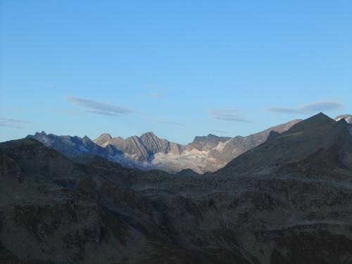 | ... und schließlich steigen wir, das letzte Tageslicht über dem Ankogelgebiet genießend, neben einem riesigem, fetten, unscheuen Murmeltier hinab zu den Almen im Naßfeld und von dort in der Dunkelheit zurück zur - trotz vorgerückter Stunde - noch immer lauten Großbaustelle in Sportgastein. |