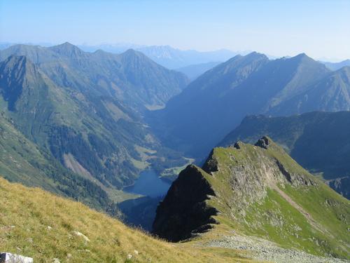 Kurz unterhalb des Schöneck-Gipfels öffnet sich der Blick hinunter zum Schwarzensee ...