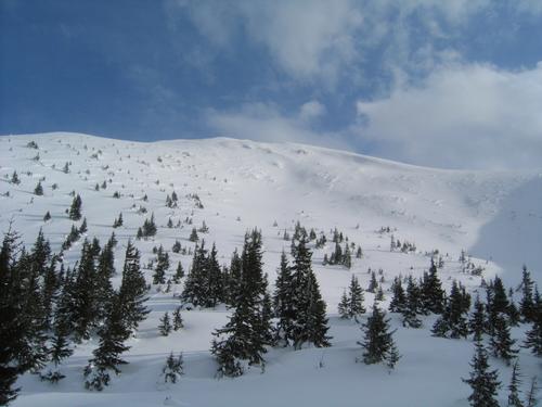 | Der letzte bis zu 30 Grad steile Hang hat es aber für Schneeschuhe in sich. Teilweise pickelharter Schnee und stellenweise grund- und haltlose Triebschneeansammlungen. |