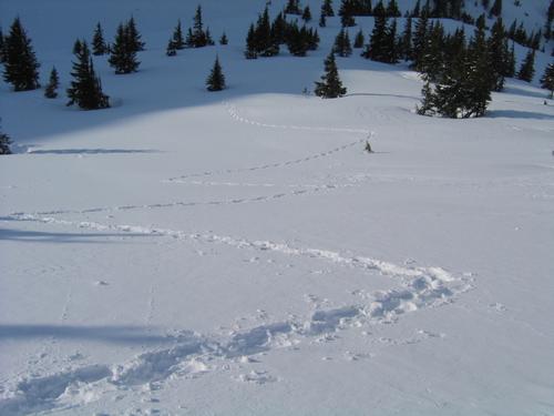 | Oberhalb der Waldgrenze. Anfangs macht es noch viel Spaß, im mäßig steilen Gelände aufwärts zu spuren. |