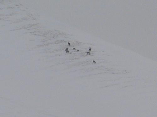 Ein Rudel Gämse tut sich am abgeblasenen Westrücken des Schüttkogel gütlich.