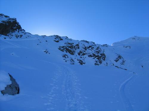 | Auf den letzten 100 Höhenmetern wird der Weg etwas alpiner. Der Aufstieg erfolgt über die linke Seite (stellenweise 35 bis 40 Grad) und über den Felsen am Grat bis zum Gipfel (ganz rechts im Bild) |