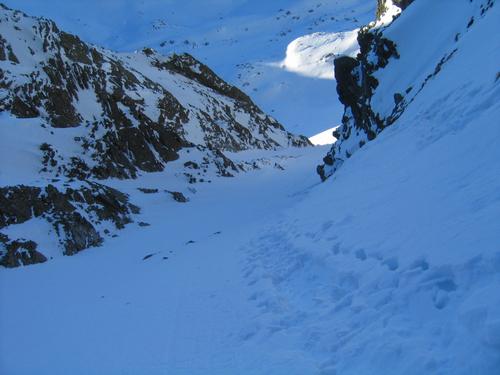 | ... und im steilsten Bereich kurz unterhalb der Scharte bei einer Steigung von ca. 40 Grad wird dem Wanderer noch einmal alles abverlangt (vor allem mit Schneeschuhen - Steigeisen wären günstiger gewesen: Aber bei dieser Erkenntnis gab es kein Zurück mehr. Und um die Steigeisen aus dem Rucksack zu holen, gab es zuwenig stabilen Halt). |