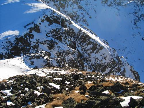 | Abstieg vom Sauberg - nur ganz oben ist leichtes Blockwerk zu überklettern. Der Einstieg in die Steilrinne liegt unterhalb der Bildmitte am linken Bildrand. Die Rinne führt dann zwischen den Felsen nach rechts hinunter. |