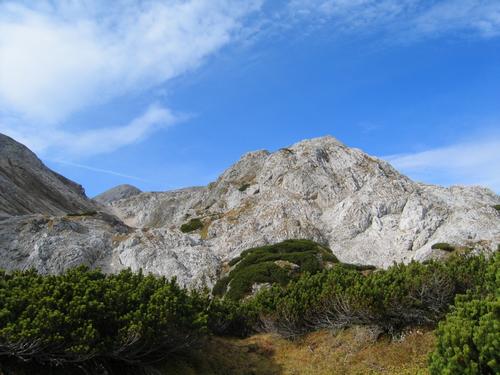 | ... bis man schließlich bei einer Höhe von ca. 2.100 Metern auf den Wanderweg vom Guttenberghaus zur Gjaidalm trifft, der die Dachsteinplateauhochfläche "Auf dem Stein" in Süd-Nord-Richtung durchzieht. Laut Karte gibt es unweit des Weges einen benannten 2000-er namens "Hundsofen". Und der einzige erkennbare Berg hier lag direkt vor uns. Also nichts wie rauf auf den Hundsofen ... |