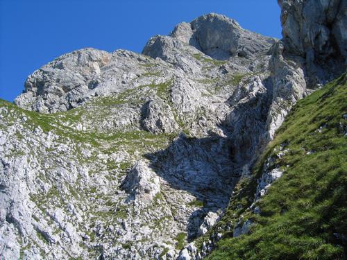 | Das steinschlaggefährdete Gelände lasse ich nun hinter mir. Da außer mir aber heute ohnehin niemand unterwegs war, hielt sich die Gefahr in Grenzen. Nur einmal kamen einige Steine - vermutlich von einer Gams losgetreten - herunter. |