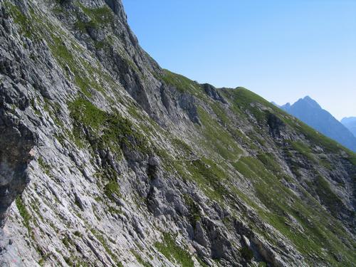 Aber auch nach der Schlüsselstelle muß man sich bei der ausgesetzten Querung über die Südflanken noch gut konzentrieren.