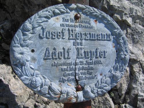 Ein kleines Kreuz mit Tafel zum Gedenken an die Bergsteiger Herzmann und Kupfer, welche die ersten Bergtoten im Gesäuse gewesen sein sollen.