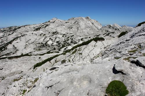 | Abstieg zurück zum markierten Weg, der aber gleich wieder Richtung Osten verlassen wird. Im zwar nicht allzu schwierigen, aber mühsam beschreitbaren, spalten- und dolinenreichen Karstgelände ... |
