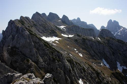| Der (Urlaubs-)Tag war noch jung, das Wetter zwar diesig, aber angenehm warm, und dort drüben - links der Bildmitte - lachte der mehrgipfelige Mandlkogel herüber. Einen markierten Weg aus Richtung Stuhlalm soll es auch geben. Also beschließe ich, auch noch den Mandlkogel zu besuchen. Rechts hinten übrigens die markante Bischofsmütze. |