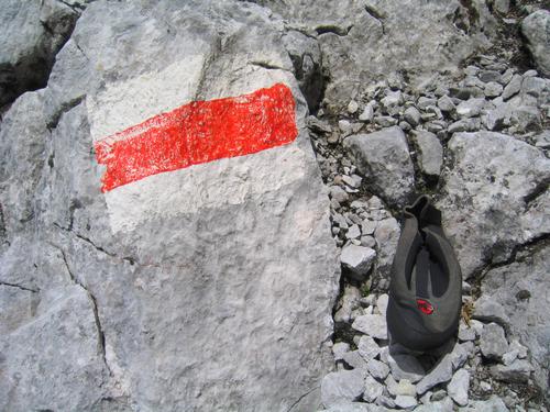 | Etwas unterhalb der Engstelle des Schotterhanges habe ich diesen etwas "verloren wirkenden Kletterpatschen" gefunden, und ihn zur besseren Wiederauffindungswahrscheinlichkeit neben einer Markierung bei der Engstelle platziert. |