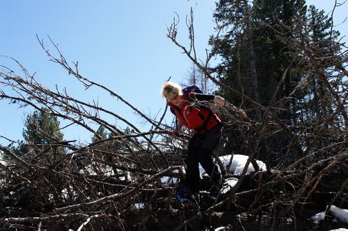 | Da in den steilen, bis zum Grund durchnässten Osthängen noch weit über 1 Meter Schnee liegt, müssen wir sicherheitshalber am Kammverlauf zuerst Richtung Norden absteigen. In einem Windwurfgebiet geht das nicht ohne kleinere Kratzer und Blessuren. |