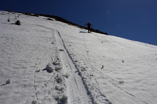 | Nordseitig finden wir in größeren Höhen selbst am frühen Nachmittag noch kompakte Firnfelder an, auf denen es sich auch mit Schneeschuhen gut abrutschen läßt. |