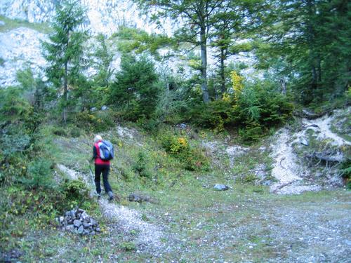 | Zur Zimitzalm gelangt man unschwierig auf ausgeschilderten Wegen. Danach folgt man noch ein kurzes Stück einem Forstweg. Bei einer Straßenverbreiterung zweigt man bei einem großen Steinmandl auf einem deutlich sichtbaren Steiglein nach links ab. |
