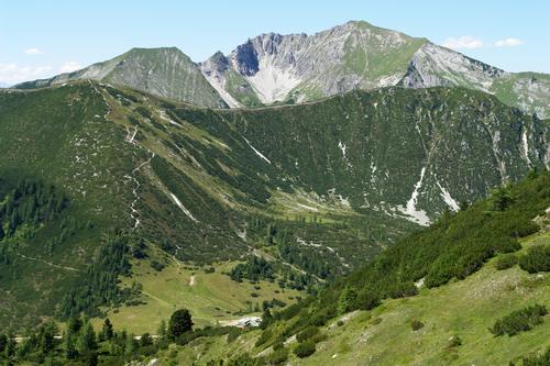 Abstieg zur Südwiener Hütte. Nördlich davon die latschenbewachsenen Erhebungen von Spirzinger und Spazeck. Dahinter ragt die Steinfeldspitze empor.