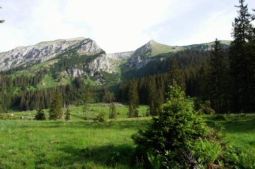 | Im Bereich der Pfarralm erhält man einen guten Überblick über 2 der geplanten 3 Gipfel. Links die Stadelfeldschneid und rechts das Hochhäusl. Die Gsuchmauer liegt etwas weiter hinten. Aufstieg über den rechten Waldrücken zum Hochhäusl. Abstieg entlang der Schiroute am steilen Wiesenhang zwischen Stadelfeldschneid und Hochhäusl. |
